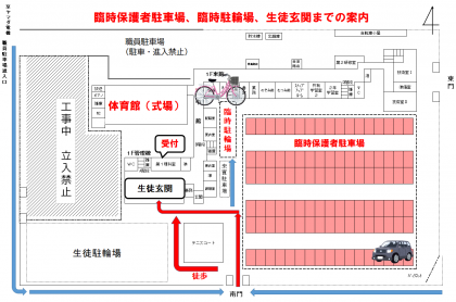 ・車での来校の際は、南門から入り、グラウンドに設けた仮駐車場に停めてください。