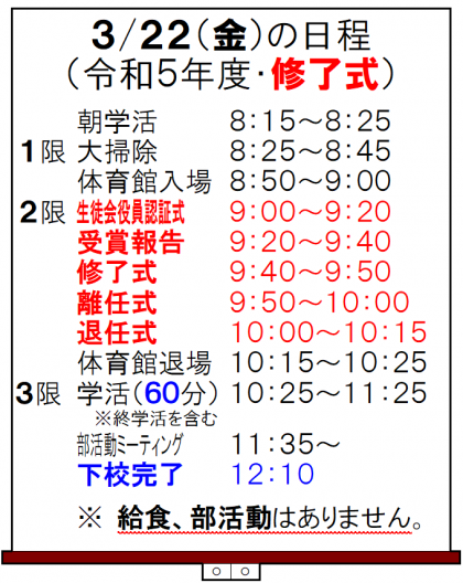 (日程は、下記のとおりです。給食、部活動はありません。)