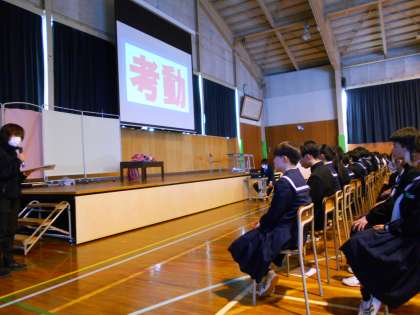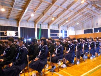 生徒集会・その2 公開日 2024/03/21 更新日 2024/03/21 生徒会活動 3月21日(木) 5限 次に、劇「ちょっとのつもりが……」を見ながら、春休みの注意点について考えました。 最後に、生徒指導主事の先生から、「考動」することや「命」の大切さについて話があり、全校生徒で確認できました。 (写真 上:真剣に集会に参加する生徒) (写真 中:劇の様子) (写真 下:生徒指導主事の先生の話)