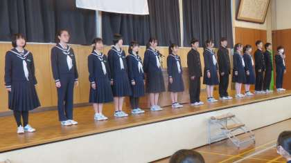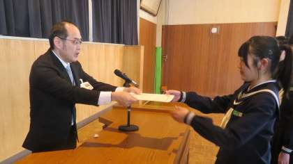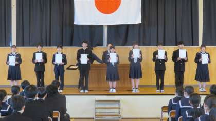 生徒会役員認証式・その1 公開日 2024/03/22 更新日 2024/03/22 生徒会活動 3月22日(金) 2限 「受賞報告」のあと、「生徒会役員認証式」を行いました。 (写真 上:旧執行部、旧専門委員長、旧学年代表の挨拶) (写真 中:新執行部の任命書授与) (写真 下:新執行部)