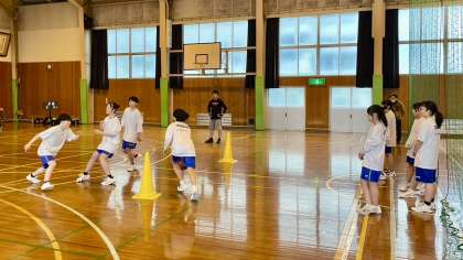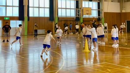 女子バスケットボール部が、スクリーンを使った攻防を練習しています。