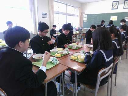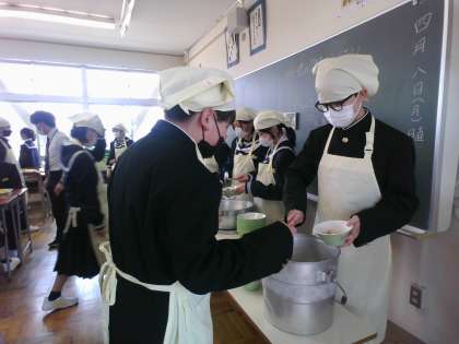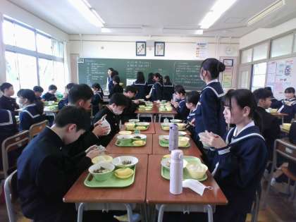 みんなで協力して配膳し、おいしい給食を食べていました。