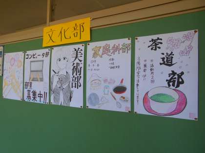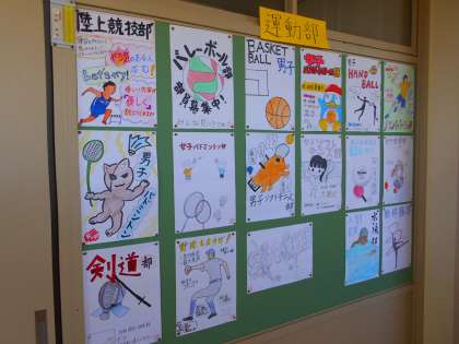 1年生の廊下には、部活動紹介のポスターが掲示されています。