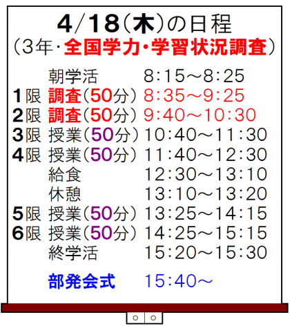 明日、3年生が、「全国学力・学習状況調査」を行うため、特別校時で運行します。