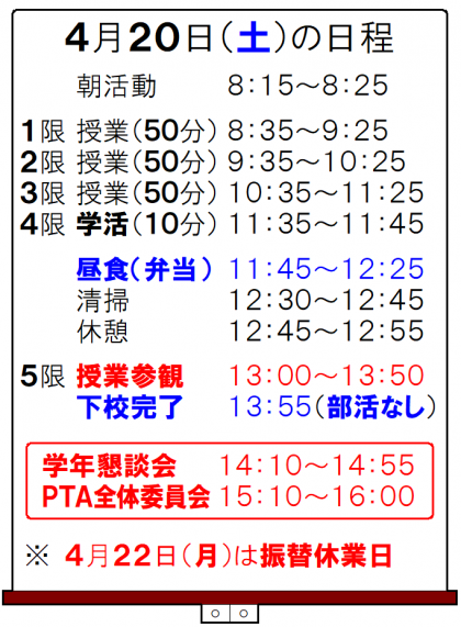 明日は、「授業参観」「学年懇談会」「PTA全体委員会」があります。