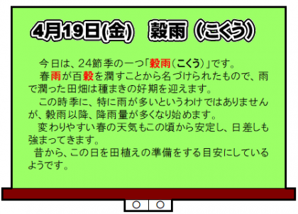 今日は、24節気の一つ「穀雨(こくう)」です。
