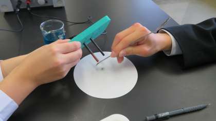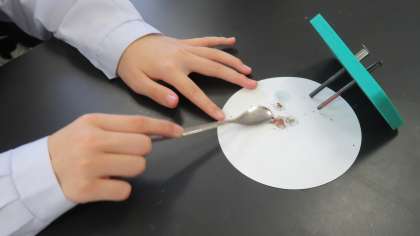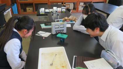 3年・理科・塩化銅水溶液の電気分解 公開日 2024/04/24 更新日 2024/04/24 3学年 4月24日(水) 1限 3年1組の理科は、第3理科室で、塩化銅水溶液の電気分解の実験を行いました。 (写真:上) 電流を流しているとき、陰極や陽極のようすを観察しました。 (写真:中) 陰極に付いた物質を金属さじで落としました。 (写真:下) 陰極に付いた物質を金属さじでこすると、銅特有の金属光沢が見られました。 どの班もテキパキと実験を進めていました。