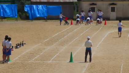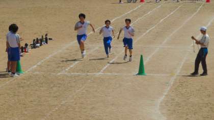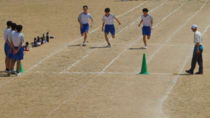3年4,5組男子の体育は、グラウンドで、短距離走です。