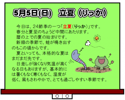 今日は、「立夏」です! 公開日 2024/05/05 更新日 2024/05/05 山室中学校のページ 5月5日(日) 10:00 今日は、24節気の一つ「立夏(りっか)」です。 どんどん田植えが行われる時期ですね!