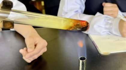 鉄粉と硫黄の粉末の混合物を試験管に入れ、ガスバーナーで熱しました。