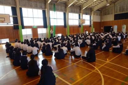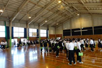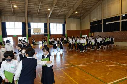 3年・学年集会 公開日 2024/05/10 更新日 2024/05/10 3学年 5月10日(金) 4限 3年生は、体育館で、学年集会(修学旅行事前学習)を開きました。 新幹線の乗車訓練(座席の順に列を作り、すばやく乗車する練習)と、バスの座席の確認を行いました。