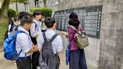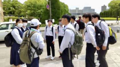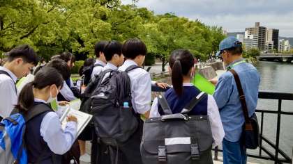平和記念公園で、各班ごとに分かれて、ボランティアの方の話を真剣に聞いています。