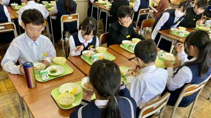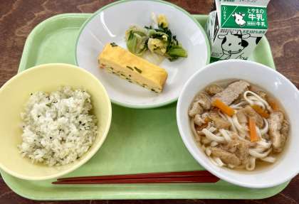 1年・炭水化物祭り?! 公開日 2024/05/15 更新日 2024/05/15 1学年 5月15日(水) 給食 今日の献立は、「菜めし、牛乳、千草焼き、おひたし、かやくうどん」です。(写真:上) (写真 中:1年4組 下:1年5組) 炭水化物が多いかなと感じますが、生徒は大好物のようです。