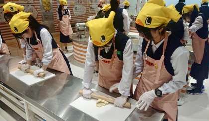 3年5組は、麺棒で麺のもとになるものを伸ばしています。