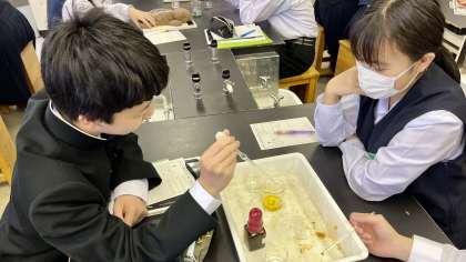 3年1組の理科は、第3理科室で、「酸とアルカリを混ぜ合わせたときの変化」を調べる実験を行いました。