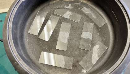 できた水溶液をスライドガラスにとり、ホットプレートで水を蒸発させました。(写真:下)
