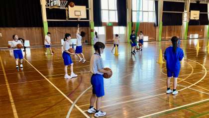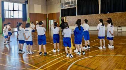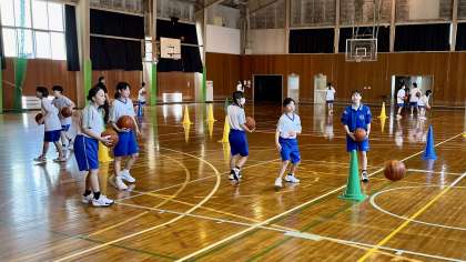 女子バスケットボール部は、サイドからのシュートについて、どの角度で打てばよいかコーチに教わっています。