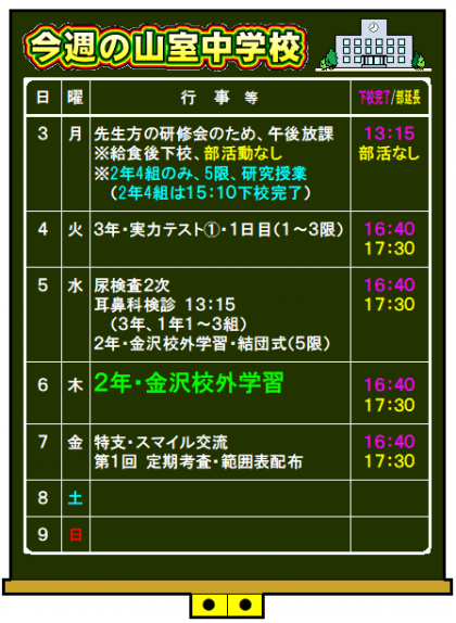 明日3日(月)は、先生方の研修会のため、給食後放課になります。