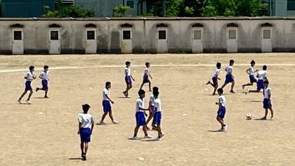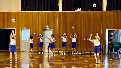 3年1組の体育は、男子はグラウンドでサッカー(写真:上)、女子は体育館でバレーボール「直上・アンダーパス練習」(写真:下)をしていました。