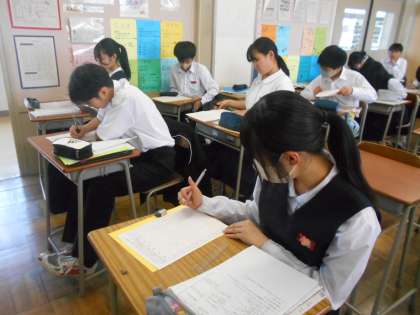 3年・国語・作られた「物語」を超えて 公開日 2024/06/12 更新日 2024/06/12 3学年 6月12日(水) 6限 3年5組の国語では、「作られた『物語』を超えて」の文章を読んで批評文を書きました。 初めての批評文に苦戦しながらも頑張っていました。