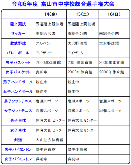 明日から、市中学校選手権大会です! 公開日 2024/06/13 更新日 2024/06/13 部活動 6月13日(木) 明日からの市中学校選手権大会の日程をお知らせします。 応援よろしくお願いいたします。