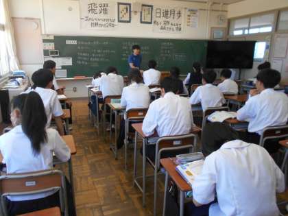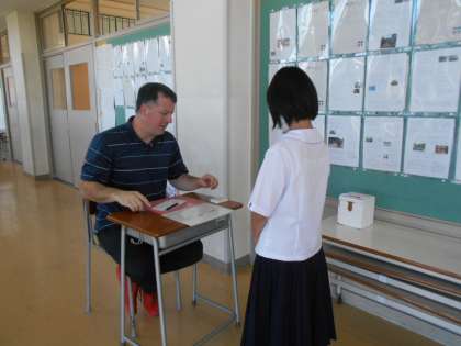 (写真 下:2年3組 英語「スピーキングテスト」)