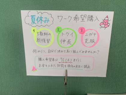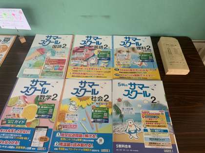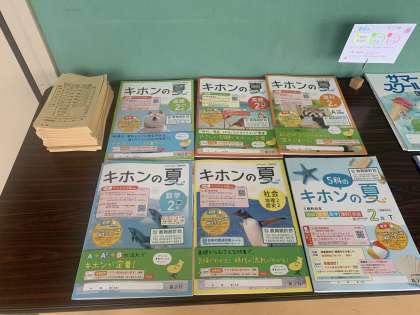 2年・「夏休みのワークはどうですか?」 公開日 2024/06/20 更新日 2024/06/20 2学年 6月20日(木) 明日21日(金)から、「夏休みのワークの希望購入」の展示をします。 ワークは2タイプあります。 ★それぞれ5教科毎の冊子 ★5教科まとめて入っている冊子 家族と相談してみてはどうですか? (※封筒にお金を入れて7月1日(木)までに提出を)