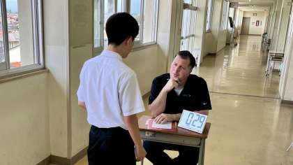 3年・授業風景 公開日 2024/06/21 更新日 2024/06/21 3学年 6月21日(金) 5限 第1回 定期考査前の最後の授業です。 (写真 上:3年1組 社会 「スポーツのルールはなんのためにあるのか」) (写真 中:3年2組 英語「スピーキングテスト」) (写真 下:3年3組 国語「「報道文を比較して読もう」