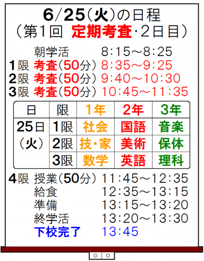 明日は、第1回 定期考査・2日目です! 公開日 2024/06/24 更新日 2024/06/24 山室中学校のページ 6月24日(月) 19:00 明日は、第1回 定期考査・2日目です。 (日程は、下記のとおりです。)