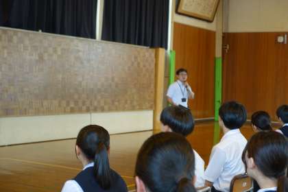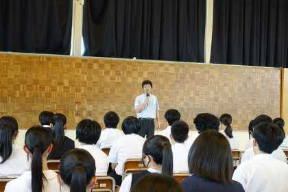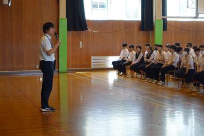 3年・学年集会・「体育大会に向けて」 公開日 2024/07/03 更新日 2024/07/04 3学年 7月4日(木) 5限 来たる体育大会と、体育大会団役員選出について話を聞きました。 先生たちの熱のこもった語り口に、全員真剣に聞き入っていました。 (写真 上:「自分たちで最高の体育大会にしよう」<大村先生>) (写真 中:「体育大会に向け普段の生活を見直そう」<室林先生>) (写真 下:「体育大会に向け学年のレベルを上げよう」<櫻井主任>)