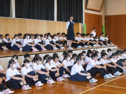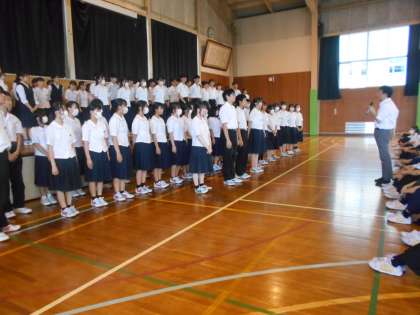 県選手権大会壮行会・吹奏楽コンクール激励会・その2 公開日 2024/07/03 更新日 2024/07/03 山室中学校のページ 7月3日(水) 6限 生徒会長による激励の言葉の後、代表選手からの挨拶、そして教頭先生からの話がありました。 最後に全校生徒より、精一杯頑張ってきてほしいという思いを込めて、拍手で応援しました。 選手の皆さん、これまで関わってくださった人への感謝の気持ちを大切に、頑張ってきてください。 健闘を祈っています。