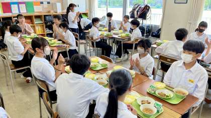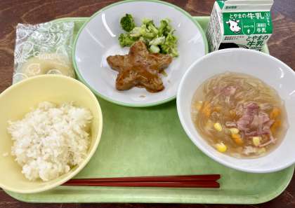今日の献立は、「ごはん、牛乳、星形ハンバーグ、そえ野菜、天の川スープ、冷凍パイン」です。(写真:上)
