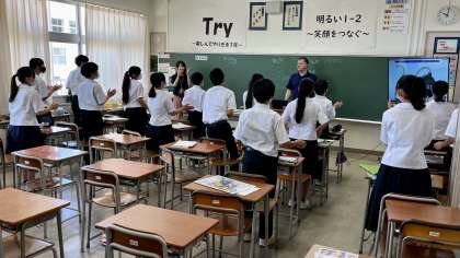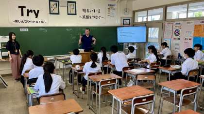 1年2組の英語は、ALTグレッグ先生と一緒に「英語の指示を聞こう」をしています。