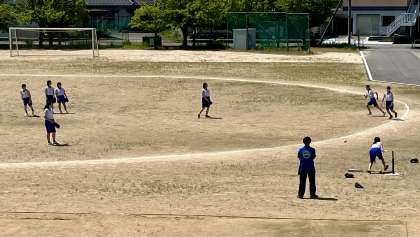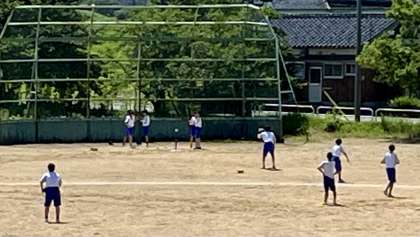 2年1組の体育は、グラウンドで、ソフトボールをしています。