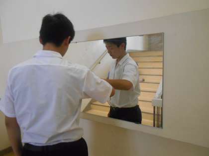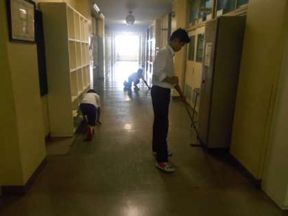 黙々と床や鏡を磨き、山室中学校も自分の心も美しくなります。