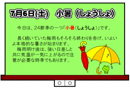 今日は、「小暑(しょうしょ)」です! 公開日 2024/07/06 更新日 2024/07/06 山室中学校のページ 7月6日(土) 11:30 気温は32度、天気はくもり。 昨日ほどではありませんが、厳しい暑さが続きます。 今日7月6日は、24節気の1つ「小暑(しょうしょ)」です。 小暑とは、梅雨が明け、暑さが本格的になる頃です。 蝉も鳴き始め、暑中見舞いを出すのもこの頃です。 暑い夏を乗り切るために、たくさん食べ、体力をつけましょう!