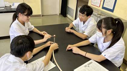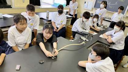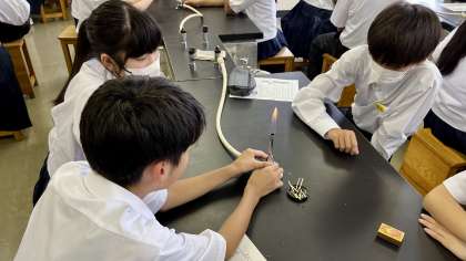 1年・理科・ガスバーナーの使い方 公開日 2024/07/11 更新日 2024/07/11 1学年 7月11日(木) 1限 1年5組の理科は、第1理科室で、ガスバーナーの使い方を学習していました。 まずは、マッチで点火するところから悪戦苦闘…… (人生で初めてマッチをする生徒もいました。) 中学校の理科の実験で加熱するときは必ずガスバーナーを使うので、はやくマスターしてほしいでね!