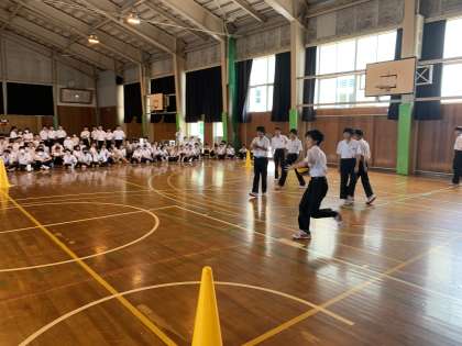 2年・学年レクリエーション・その3 公開日 2024/07/19 更新日 2024/07/19 2学年 7月19日(金) 3,4限 クラス対抗ドッジボールをしている様子です。 各クラスから選ばれた8人が1位を目指してドッジボールをしました。 自分のクラスを応援する声がとても大きかったです。 最後は、先生チームと試合をしました。 どの種目もとても盛り上がり、クラスや学年の仲が深められたレクリエーションになりました。