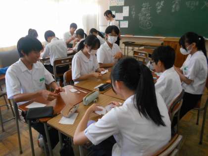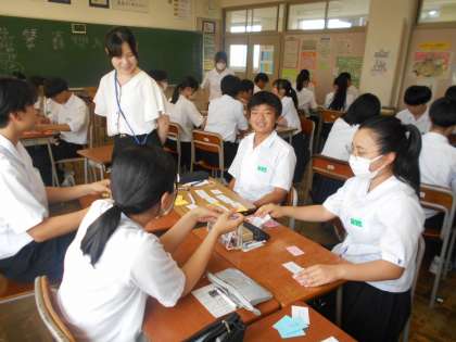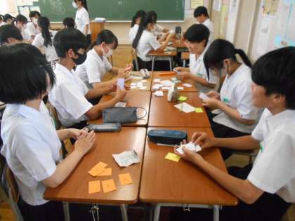 3年・学活・学級レク 公開日 2024/07/19 更新日 2024/07/20 3学年 7月19日(金) 3限 3年3組の学活は、学級レクリエーションを行っています。 カードを並べて、文章を作成し、班のメンバーに紹介しています。 和やかな雰囲気で盛り上がっています。