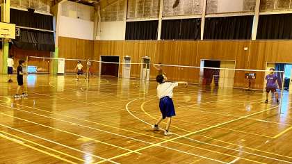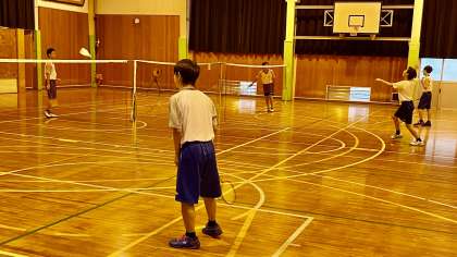 7月30日(火) 9:00 体育館の朝一番は、男子バドミントン部です。 元気いっぱいです!