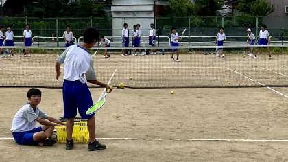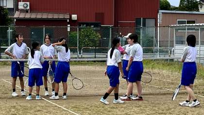 テニスコートで、ソフトテニス部が練習しています。