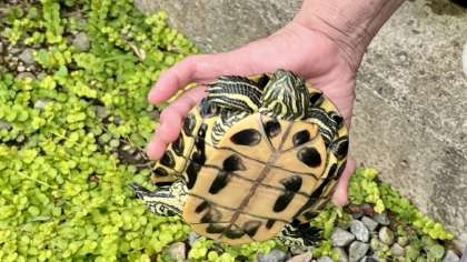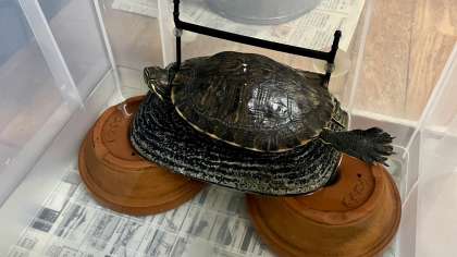 のぞみ級で飼っているミドリガメのキリトは、谷川先生んちの生活にも慣れ、リラックスしています。