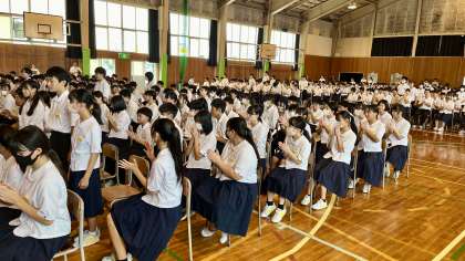 8月27日(火) 2限 全校生徒が体育館に集まり、夏休み中の受賞報告会を行いました。 ▼吹奏楽部の受賞報告