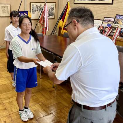 後援会、PTAからの激励金を校長先生から渡していただきました。