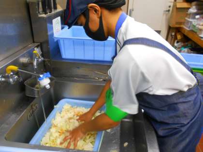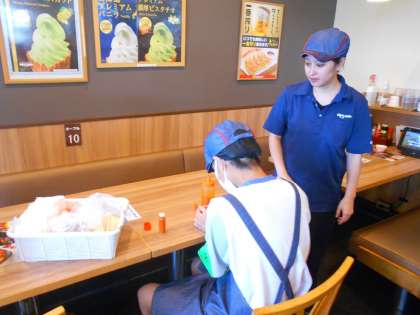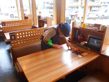 窓ふき、テーブルふき、七味の補充、野菜の水洗いをお店の方に教わりながら丁寧にしていました。