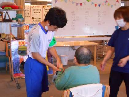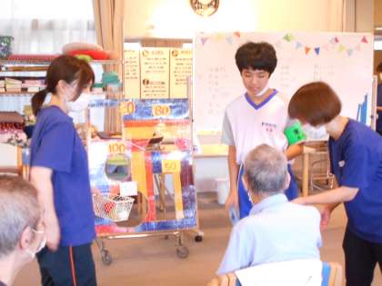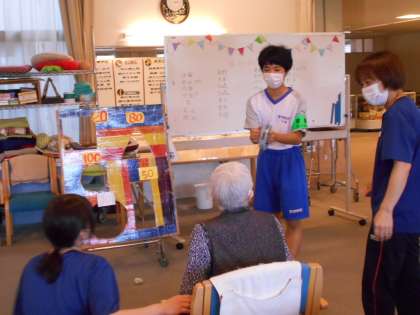 2年・14歳の挑戦・1日目・その14 公開日 2024/09/02 更新日 2024/09/02 2学年 9月2日(月) 13:00 「社会に学ぶ『14歳の挑戦』」の活動を紹介します。 「ふなん苑 デイサービスセンター」での活動の様子です。 午後のレクリエーションでは、ゲームをしました。 利用者の方へ「がんばってー!」と笑顔でエールを送り、とても楽しそうに仕事をしていました。