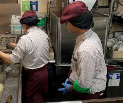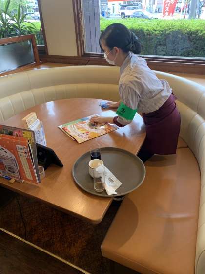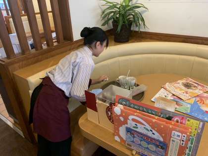2年・14歳の挑戦・1日目・その21 公開日 2024/09/02 更新日 2024/09/02 2学年 9月2日(月) 14:30 「社会に学ぶ『14歳の挑戦』」の活動を紹介します。 「ココス 本郷店」での活動の様子です。 テーブルの片付けをしています。あいさつもしっかりとできるので、従業員と間違われるほどの働きぶりだそうです。 洗い場では皿洗いを教わっています。 真剣な眼差しが印象的でした。