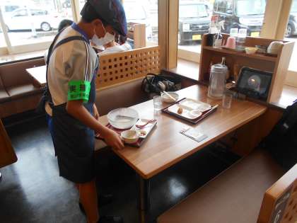 2年・14歳の挑戦・2日目・その12 公開日 2024/09/03 更新日 2024/09/03 2学年 9月3日(火) 13:30 「社会に学ぶ『14歳の挑戦』の活動の様子を紹介します。 「8番らーめん 中川原店」での活動の様子です。 机や食器の片付けを一生懸命取り組んでいました。 大きな声で接客をしている様子も見られました。