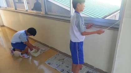 2年・14歳の挑戦・4日目・その1 公開日 2024/09/05 更新日 2024/09/05 2学年 9月5日(木) 9:00 「社会に学ぶ『14歳の挑戦』」の活動を紹介します。 「事業所が休みのため、学校に登校した生徒」の活動の様子です。 ペンキ塗り作業はどんどん進み、壁が真っ白になってきました。 また、各事業所で一生懸命取り組んでいる写真を使って掲示物を作っています。 2年生のみなさん、月曜日からの登校をお楽しみに!
