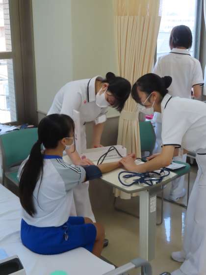 2年・14歳の挑戦・4日目・その12 公開日 2024/09/05 更新日 2024/09/05 2学年 9月5日(木) 11:30 「社会に学ぶ『14歳の挑戦』」の活動を紹介します。 「富山市立看護専門学校」での活動の様子です。 看護専門学校生に血圧と脈を測ってもらっています。 普段できない体験が多くできて、貴重な体験となっています!と話していました。